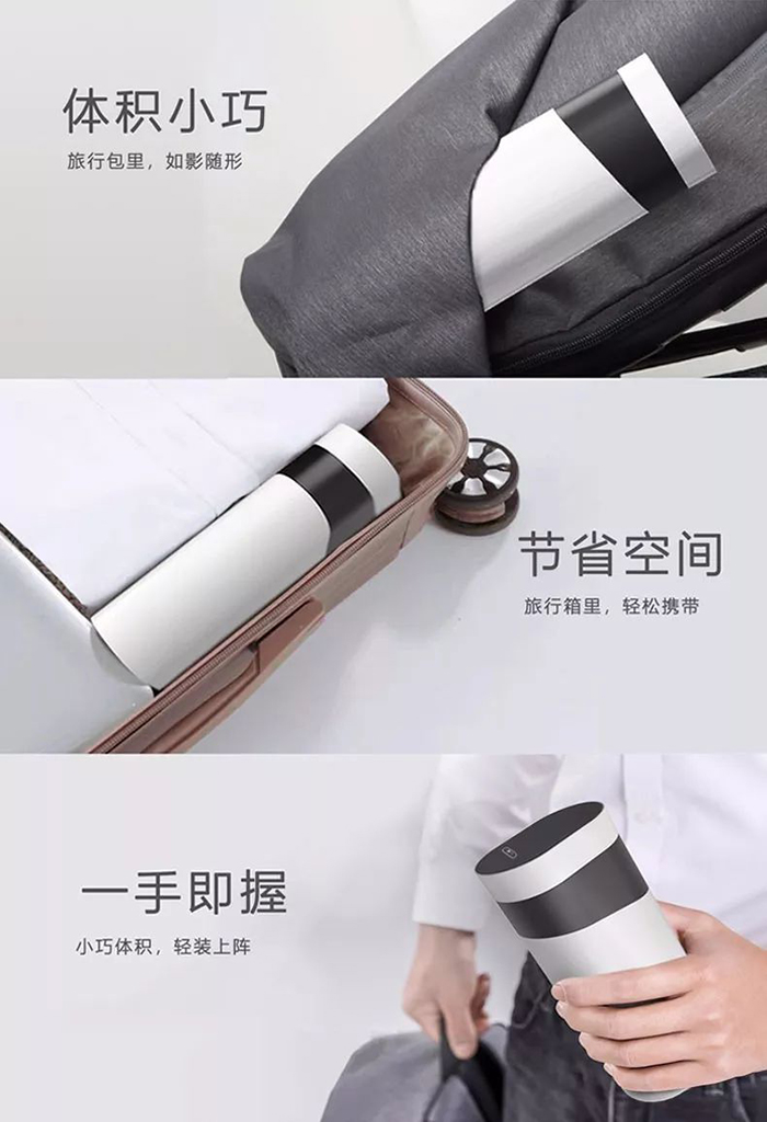 520g的轻便重量,比银行卡还小的切面。一手可握,轻巧便捷。移动水壶,轻松随行。