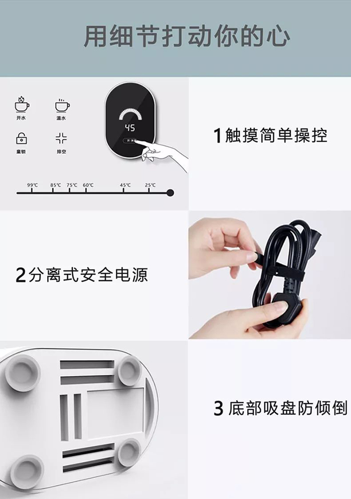 除100度煮沸功能外,它还具备2档温度可选,45度和85度。依照需求,随心调节。